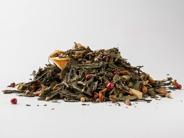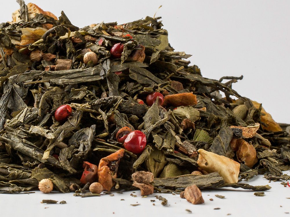 Opis Chińska zielona herbata z cynamonem, kawałkami jabłka i pomarańczy, kardamonem, kolendrą, goździkami i różowym pieprzem. Wartość odżywcza na 100 ml: Energia 3 kJ / 1 kcal. Tłuszcz <0,1 g, w tym nasycone <0,1 g. Węglowodany 0,1 g, w tym cukry <0,1 g. Białko <0,1 g. Sól <0,1 g.