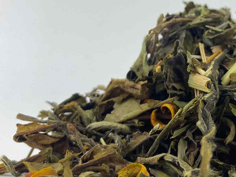 Opis: Biała herbata Shou Mei, Pai Mu Tan, Snow Buds (66%), zielona herbata bancha, imbir (6,1%), trawa cytrynowa (4,6%), kwiaty pomarańczy, naturalny aromat. Deklaracja wartości odżywczych na 100 ml: