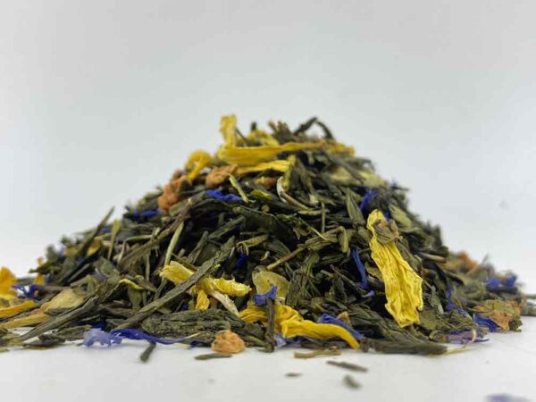 Opis: Zielona herbata Sencha, banan (banan, olej kokosowy, cukier, aromat bananowy, miód), mango (mango, cukier, regulator kwasowości: kwas cytrynowy), melon (melon, cukier, regulator kwasowości: kwas cytrynowy), aromat, kwiaty marakui i słonecznika, liofilizowana guawa (przecier jabłkowy i guawa, sok jabłkowy, przeciwutleniacz: kwas askorbinowy), kwiaty chabra. Wartość odżywcza na 100 ml: