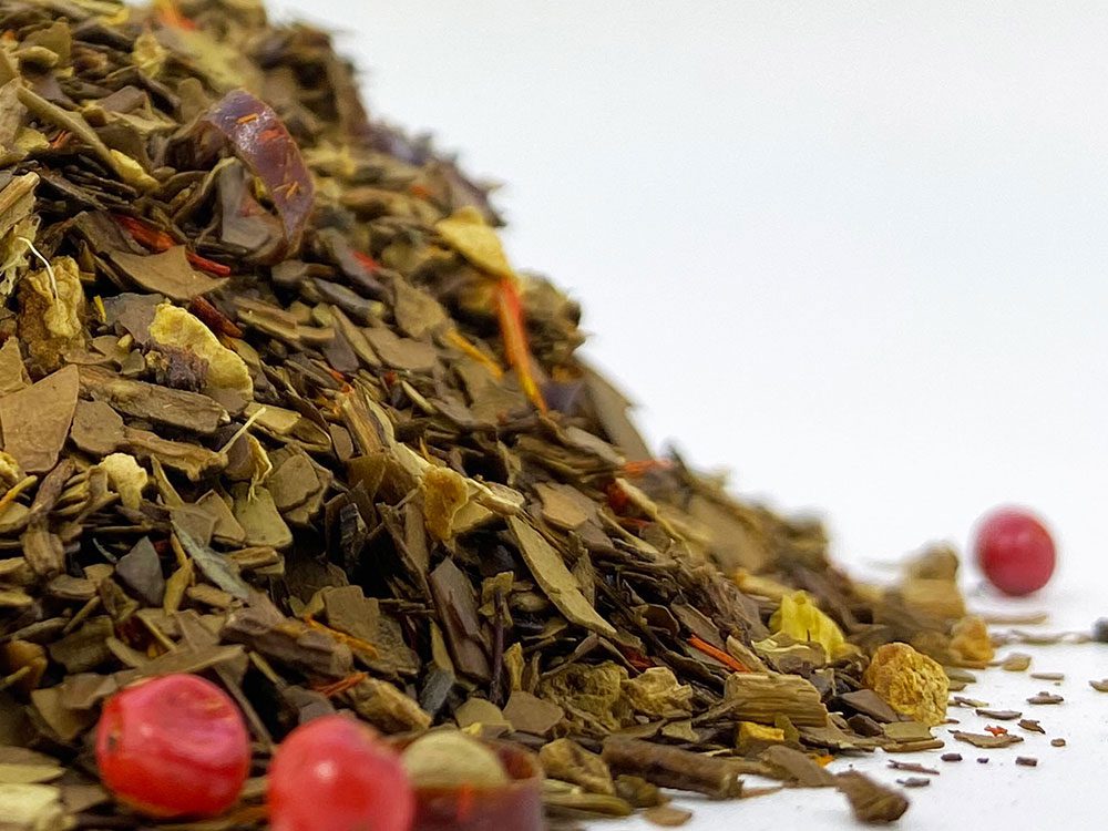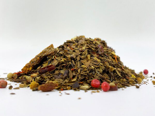 Opis: Prażona maté (68,2%), imbir, plasterki pomarańczy, biała i czerwona papryka, jagody goji, piwonia, drzewo sandałowe, chili, kwiaty ostu, słonecznik. To ulubiony napój w Ameryce Południowej, gdzie spożywa się go przez cały dzień. Wyjątkowy smak i bardzo orzeźwiający. Idealny napój na poranek. Wartość odżywcza na 100 ml: Energia 18 kJ / 4 kcal. Tłuszcze <0 g, w tym nasycone <0 g. Węglowodany <0 g, w tym cukry <0 g. Białko <0,1 g. Sól <0,3 g.