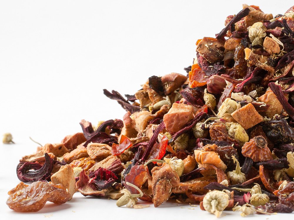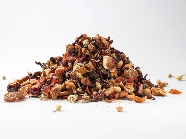 Opis: Kawałki jabłka, winogrona (winogrona, słonecznik), truskawki, hibiskus, rumianek, krokosz barwierski, aromat. Bez kofeiny. Deklaracja wartości odżywczych na 100 ml: