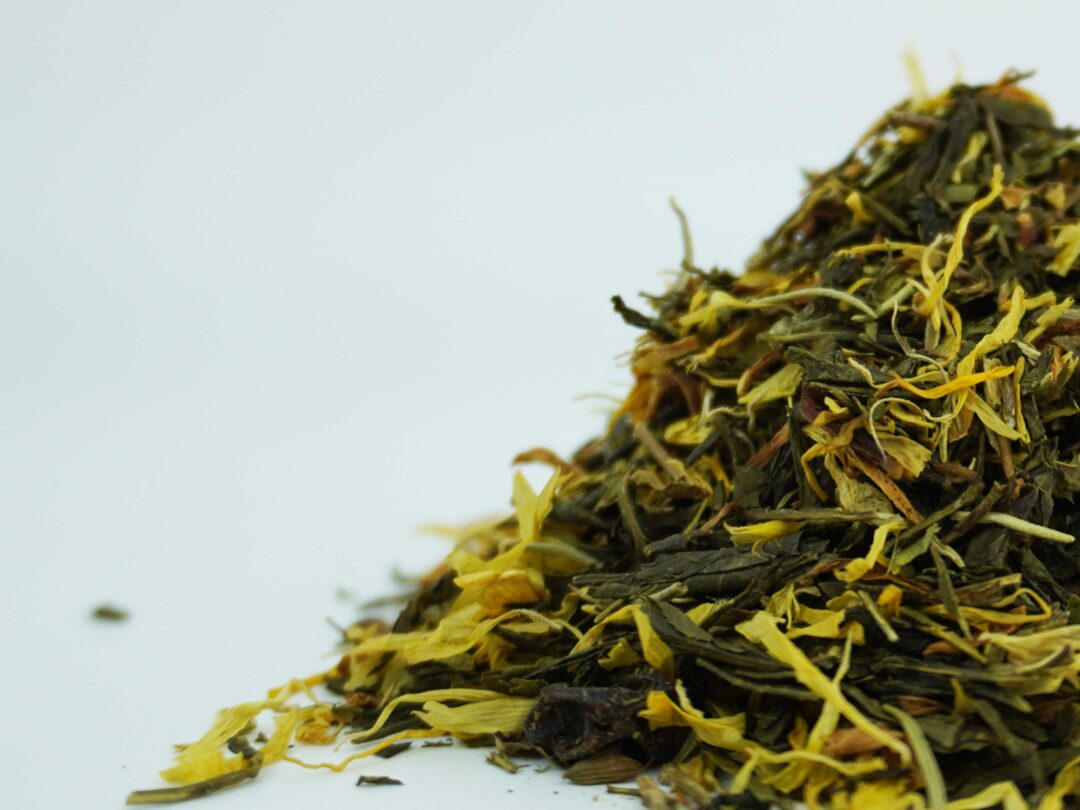 Opis Zielona herbata Sencha (52%), rodzynki (rodzynki, olej słonecznikowy), plasterki cytryny, mięta, kwiaty pomarańczy, kwiaty nagietka, liście mięty, rozmaryn, naturalny aromat. Deklaracja wartości odżywczych na 100 ml: