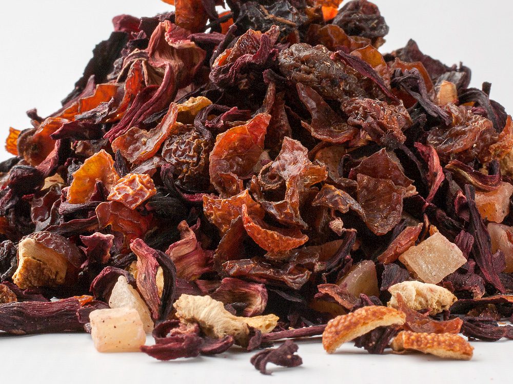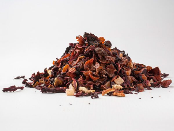 Opis: Hibiskus, owoce dzikiej róży, rodzynki (winogrona, cukier trzcinowy, regulator kwasowości: kwas cytrynowy), ananas (ananas, cukier trzcinowy, regulator kwasowości: kwas cytrynowy), mango (mango, cukier trzcinowy, regulator kwasowości: kwas cytrynowy), skórka pomarańczowa, papaja (papaja, cukier z trzciny cukrowej, regulator kwasowości: kwas cytrynowy), aromat. Bez kofeiny. Wartość odżywcza na 100 ml: